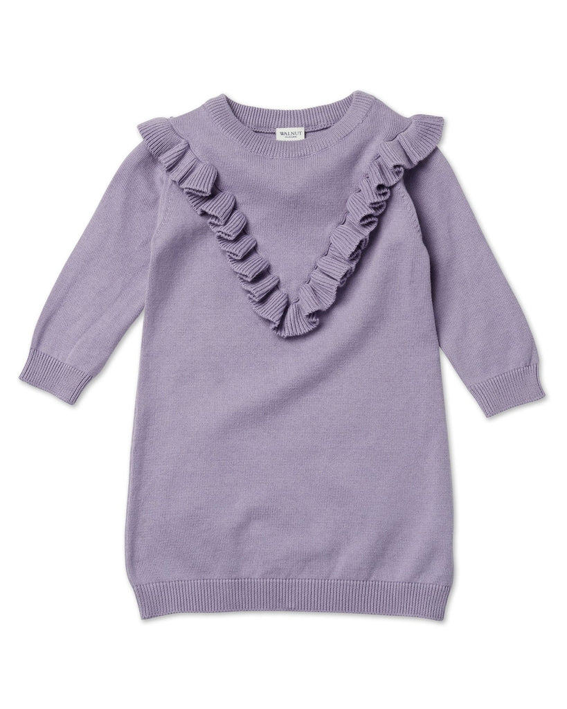 The Lottie Frill Dress is an adorable knitted dress with a feature V-shaped frill on the front and back.