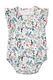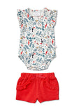 White bodysuit with frill on sleeve and flamingo print. Matching shorts with ruffle feature on pocket.