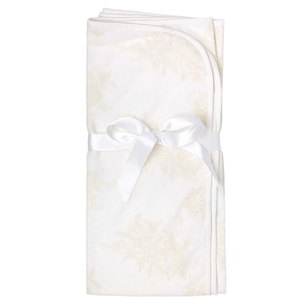 The Madison Christening Blanket features delicate embroidered lace tulle over soft cotton fabric with a satin bow tie. To be paired with the Madison Christening Collection.