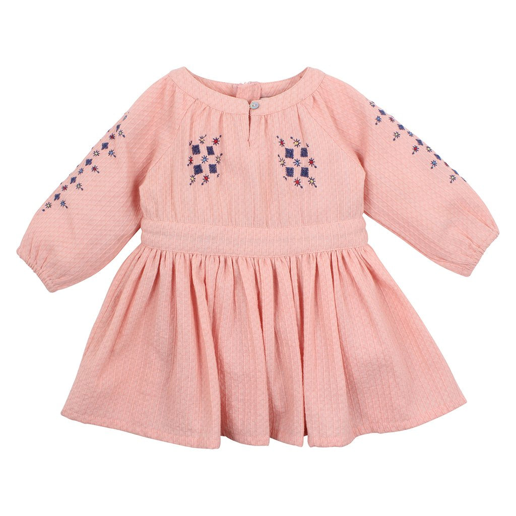 Long sleeve, dusty pink dress with embroidery on the front and sleeves.