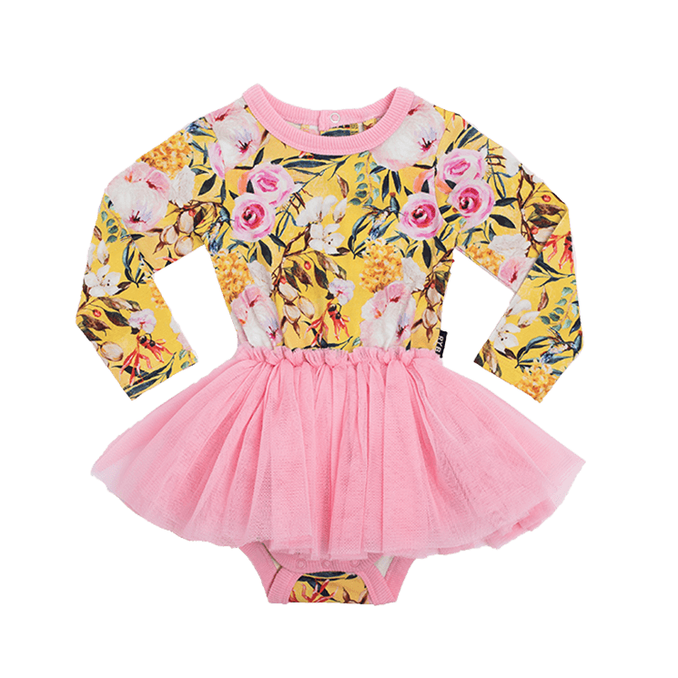 The Sturt Pea print and your little wildflower are like two peas in a pod! Made from 95% Cotton, 5% Elastane, with a tulle skirt for twirling and snap buttons for easy dressing. The Sturt Pea long sleeve baby Circus Dress is just too cute! It's the perfect Winter look for your little pea!