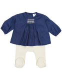Korango Classique Girl Lined Hand Smocked Blouse with Knit Leggings - Navy/Beige