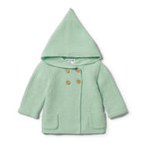 Wilson and Frenchy's best selling knitted jacket with hood in soft moss green features a double breasted front opening, and rolled up sleeve hem. Made from a luxurious blend of Cotton /Bamboo and Wool, their knitted jackets are created to stand the test of time. looking brand new after every wash. Fabric Composition: 50% Cotton / 43% Bamboo / 7% Wool.