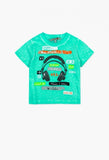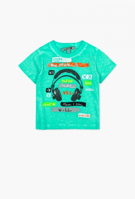 Slub knit t-shirt for baby boys. Sizes from 6 m to 4 years. Lake green. Decorative multicoloured print. This garment has been through a dyeing process that gives it a worn look.