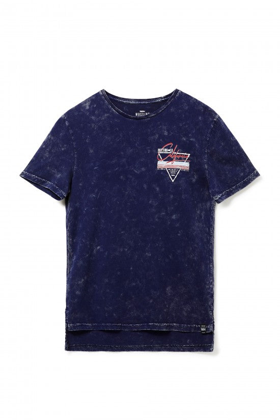Give your young guy a comfortable but cool look with this cotton jersey tee. Featuring multicolour chest print, step hem and overall acid wash this tee is weekend ready.