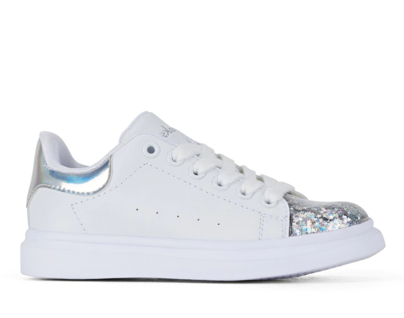 Queenie - Girl’s lace-up lifestyle sneakers. Perfect for city and playground adventures. They offer an athletic yet glamorous look thanks to the glittered toe cap and metallic heel. While the sole is lightweight and flexible, perfect for all-day play.