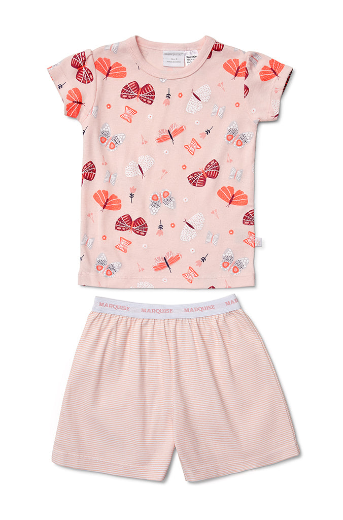 Short sleeve pink pyjama top with butterflies print and pink striped pyjama shorts. Made from 100% cotton, these girls summer pyjamas are comfy and cosy for warmer nights.