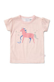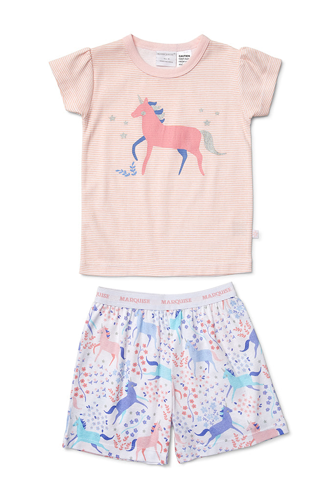 Short sleeve pink striped pyjama top with unicorn print and matching pyjama shorts. Made from 100% cotton, these girls summer pyjamas are comfy and cosy for warmer nights.